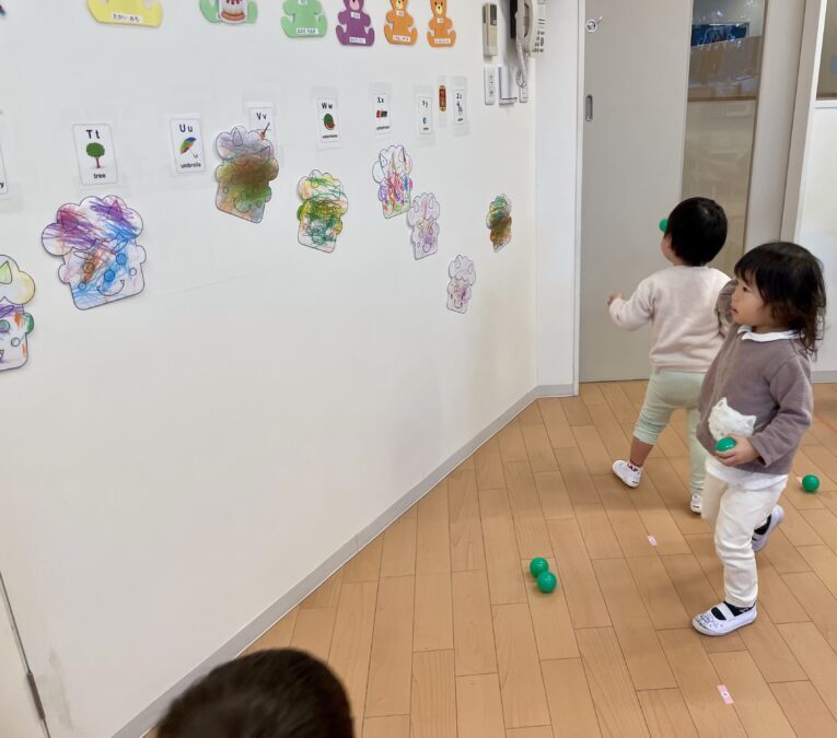 絵本『おなかのなかにオニがいる』を真似て皆んなで先日作った鬼のお面👹この日は自分で壁に貼って豆ボールで、自分のお腹の鬼を祓いました。