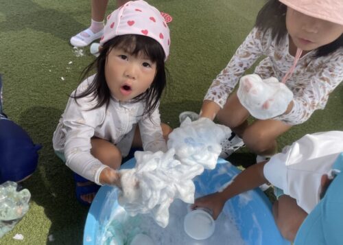 スポンジを使って泡を作ったり作った泡でおままごとをしたりして遊びましたよ![]()