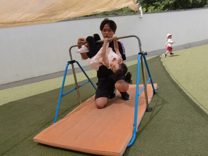 少し高い鉄棒で、お猿さんみたいにブラブラ〜🐒