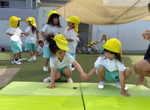 今日のでんぐり返しではお友だちと手を繋いで、「せーの‼️」