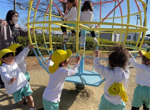 自分たちで回せるようになった回転遊具では「もういいかい〜」「回すよ!」と楽しそうな声が![]()