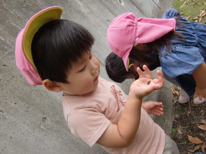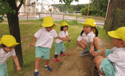 みんなで長い木の根を見つけて「うんとこしょ!どっこいしょ!」なかなかぬけないので何度も応援を呼んでどんどん友だちが集まっていました![]()