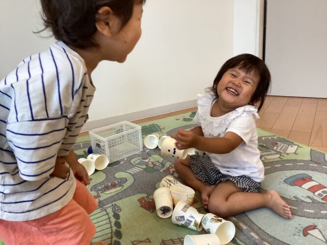 今朝、先日皆んなで作った紙コップ積み木を並べたり積んだりして遊ぶお友達😆壊れても「もう一回!」と遊べる様になってきました。