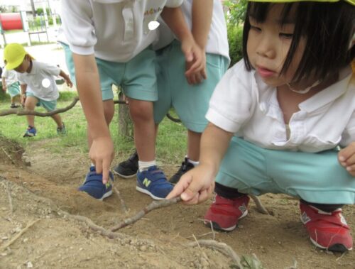 木の根の近くには石が埋まっているのを発見したお友だち💡
