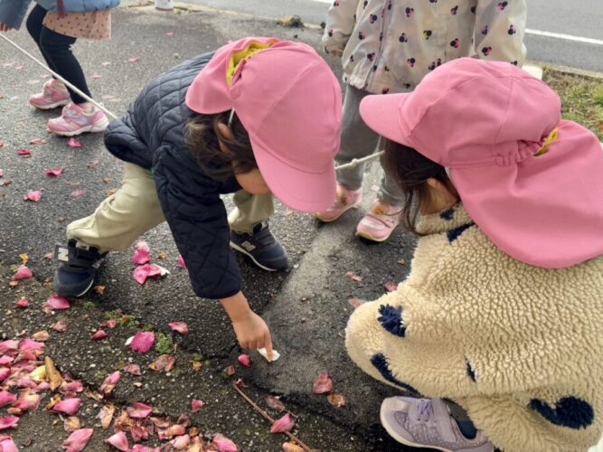お散歩ではサザンカの花びらを拾って「ハートみたいで可愛いね🩷」とポケットに入れて持ち帰る子も😘