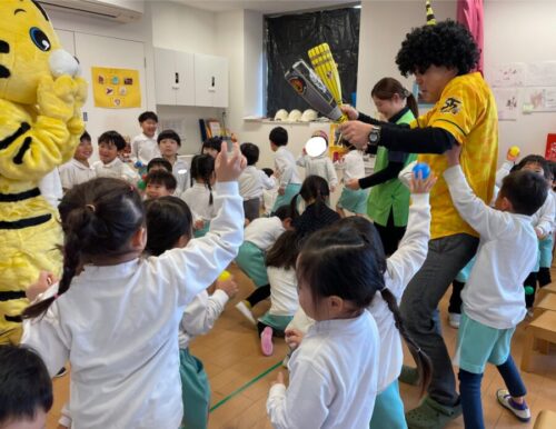 みんなで鬼の的に向かってボールで豆まき!「鬼は外〜福はうち〜」と言いながらやっつけていると。。。