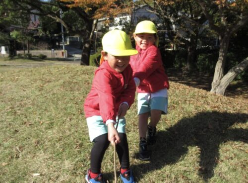 大きなツルを見つけて引っ張り合いっこ![]()
