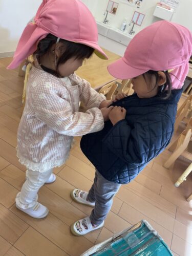 お散歩の準備をお友達が手伝ってくれています🥰