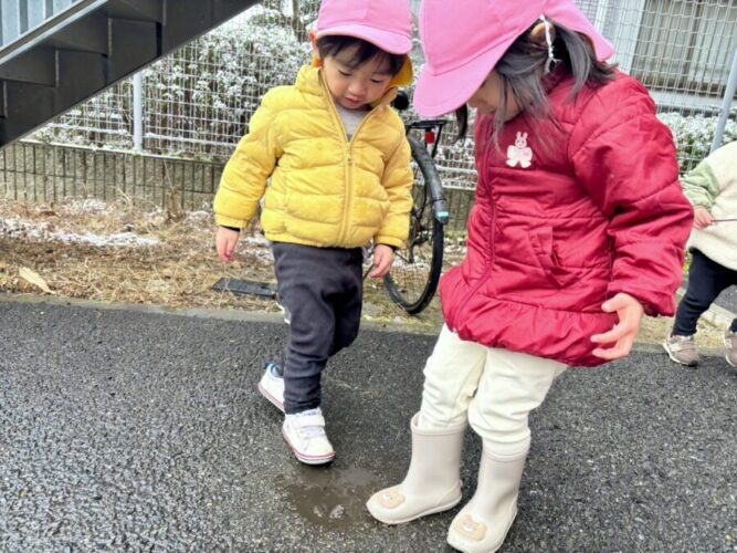 「水たまりに雪を入れたらなくなったよ💡」と子どもたちは発見👀✨