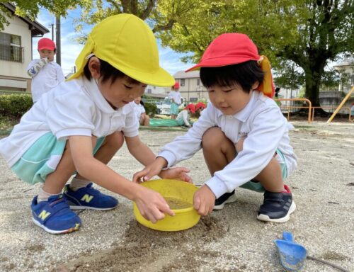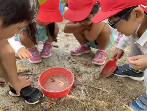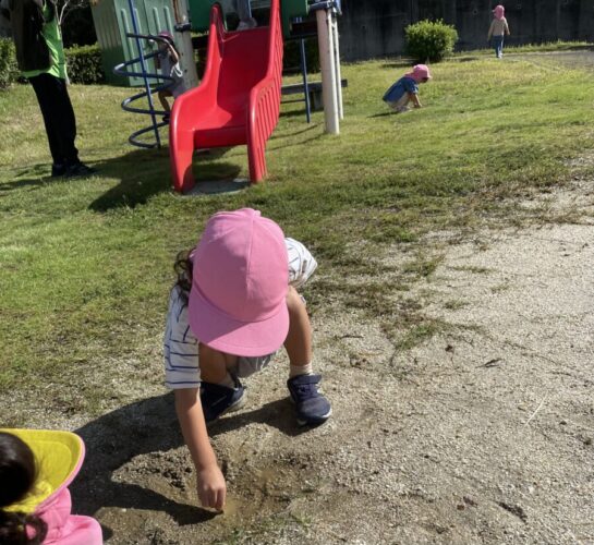 砂場に幼虫を発見し、観察しているお友だち🐛