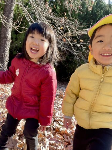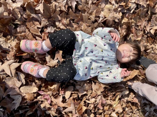 保育者が落ち葉を集めるとゴロンとダイブを繰り返すお友達🤣