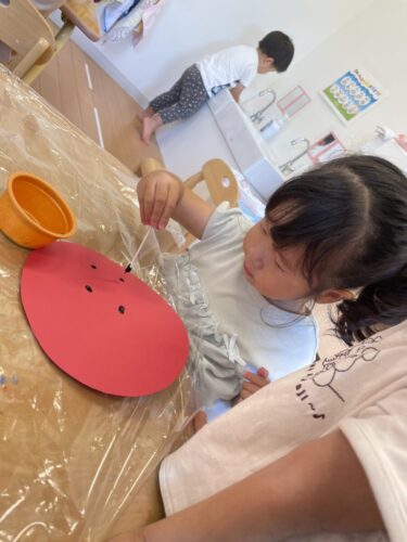 まんまるスイカに綿棒でトントンとタネをつけました。🍉