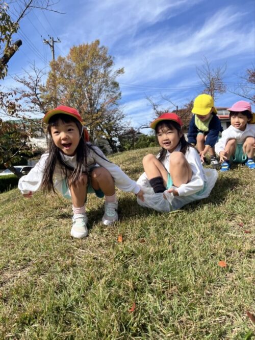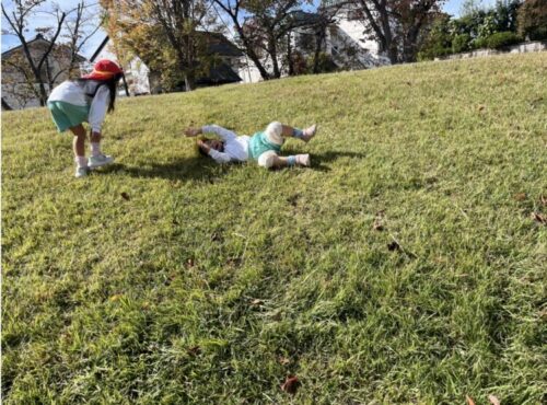 芝生の坂で転がって遊ぶお友だち![]()