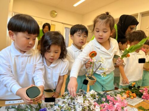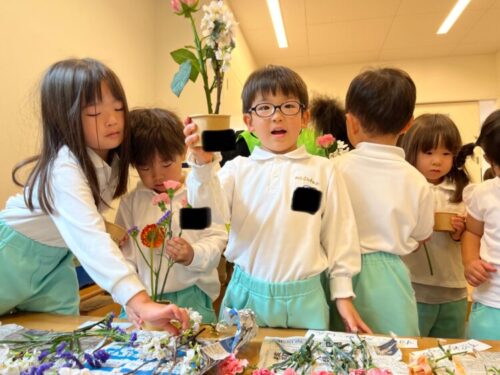 ぱんだ組さんは初めてのフラワーアートきりん、くま組さんに教えてもらいながら、楽しそうにやっていましたよ
