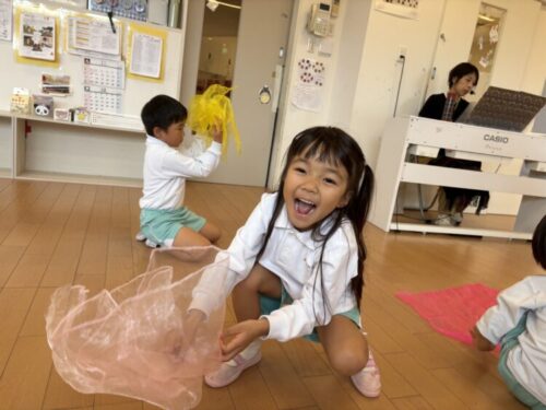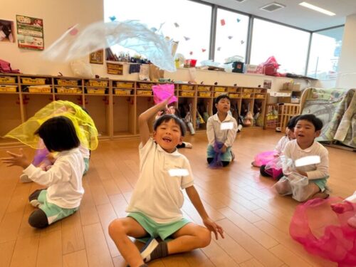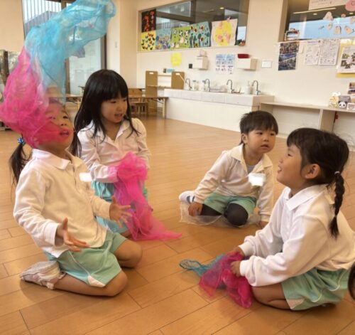 スカーフを落ち葉に見立てて大きく飛ばしたりキャッチしたり❣️