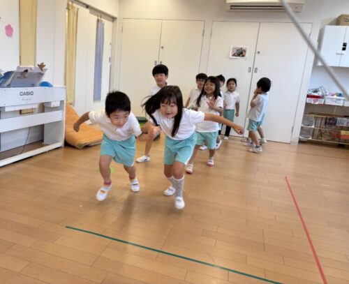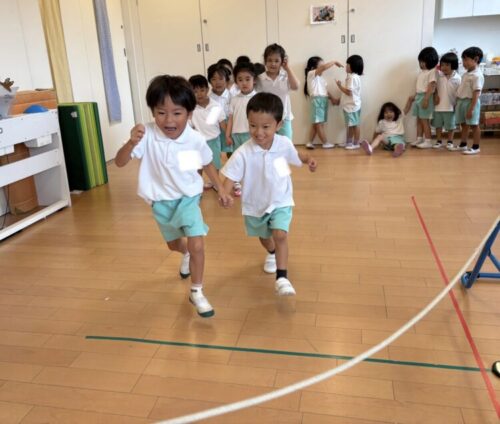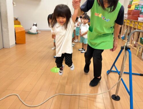 長縄を踏まないようにピョーンと飛び越えるお友だち![]()