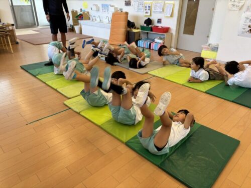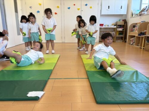 きりん組さんは前転に挑戦!ビブスを膝に挟んで、落とさないようにくるっと回っていましたよ🎵