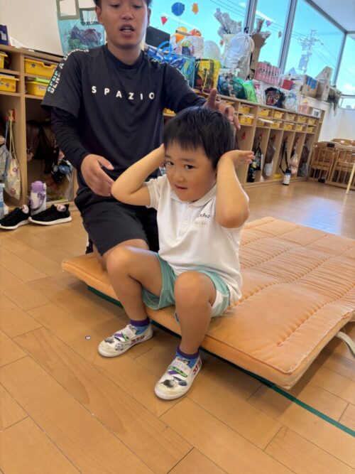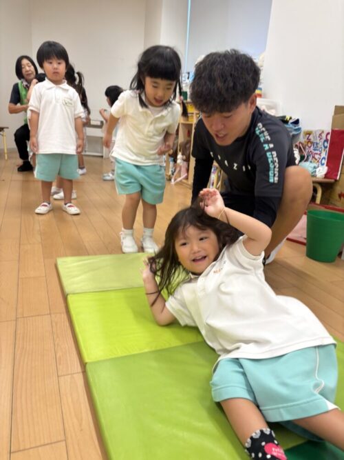 きりんさんは、ござを使って素早い前転に挑戦‼️以前より上達していて成長を感じました🩵