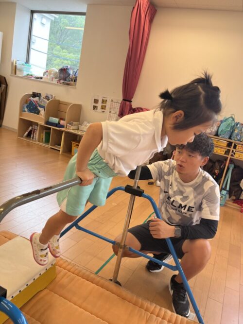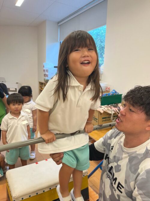 鉄棒の上に乗れて嬉しそうなお友だち