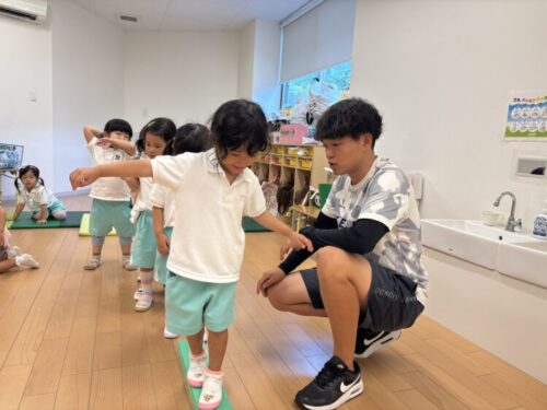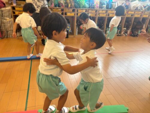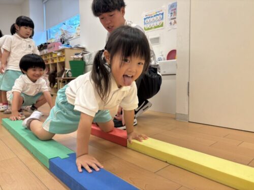 そのあとは、平均台に二人ペアで乗ってすれ違いながら渡れるかチャレンジ