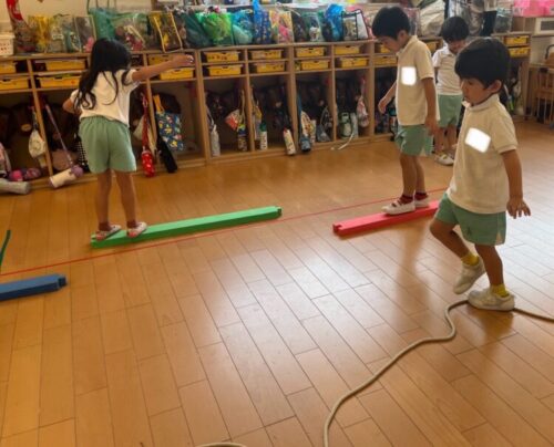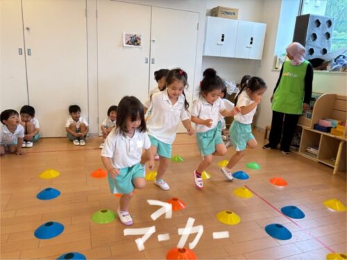 きりん組さんは、マーカーを避けながらケンケンでゴールまでいく遊びをしましたよ![]()