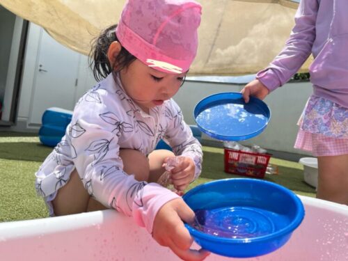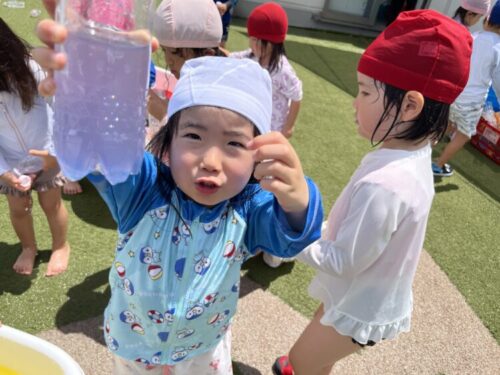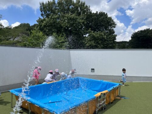 誕生会のあと、ぱんだ組・きりん組は水遊びを楽しみました