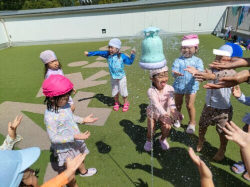 噴水のように水が出る玩具に大喜びのお友だち![]()