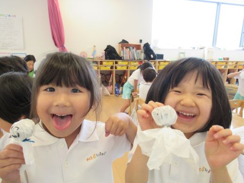 くまぐみさんクッキングでおにぎりを作ってピクニックをする予定なので、午後から晴れますようにとてるてる坊主を作ってくれました![]()