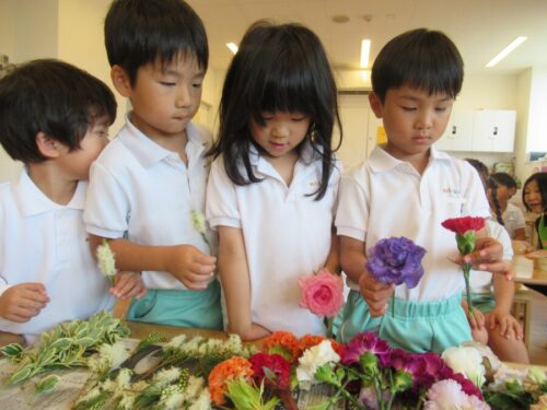 ケイトウ、バラ、スプレーカーネーション、トルコキキョウ、カスミソウなどのたくさんの中から好きなお花を順番に選びました🌼🌹