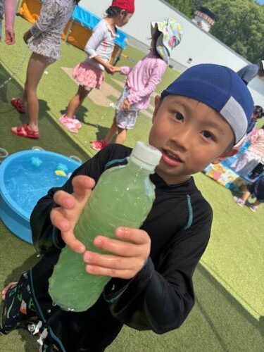 色水遊びで黄色と青色混ぜたらこんな色になったよと教えてくれました![]()