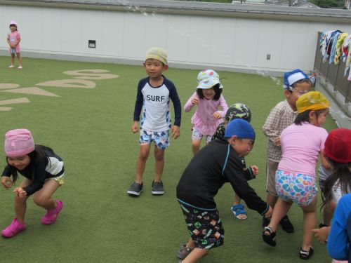 先生がホースから出す水に当たらないように通り抜けるゲームもしました![]()