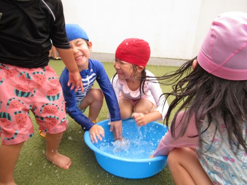 桶に入った水をバシャバシャとしたり掛け合ったりすることも楽しんでいました![]()