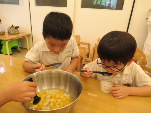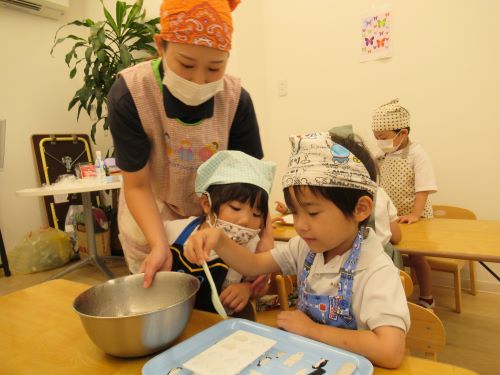 寒天ゼリーの液をこぼさないように型に流し込んでいるお友だち💕上手にできたね!