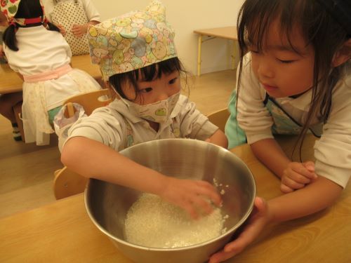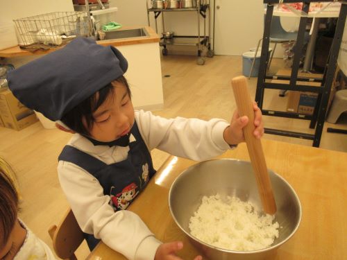 ご飯が炊けたら、めん棒を使って優しくついたよ😊優しく丁寧に行うみんなでした💛