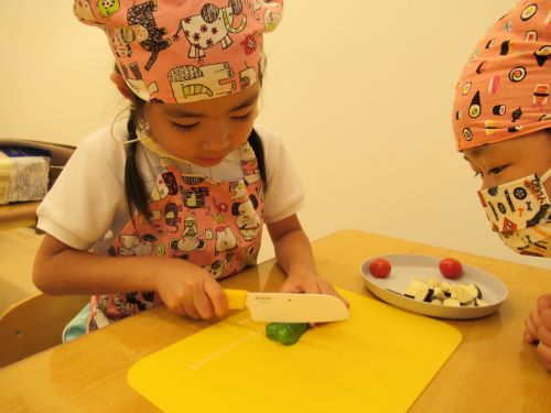 ピーマン、ナス、ミニトマトを自分たちで切りました👏