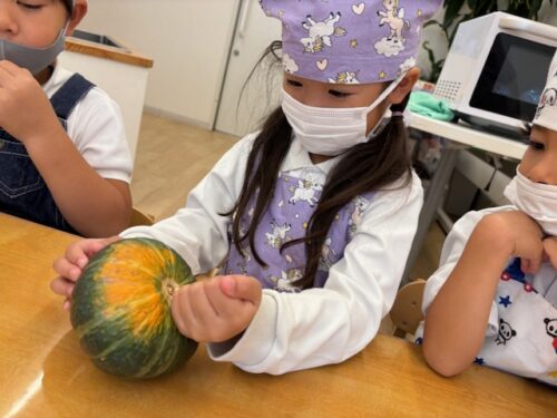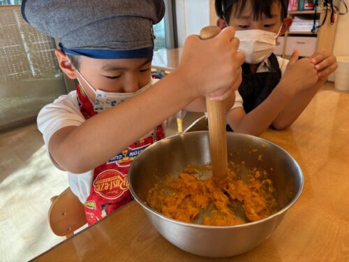 かぼちゃをつぶして、バター、砂糖、牛乳を加えて混ぜ混ぜ![]()