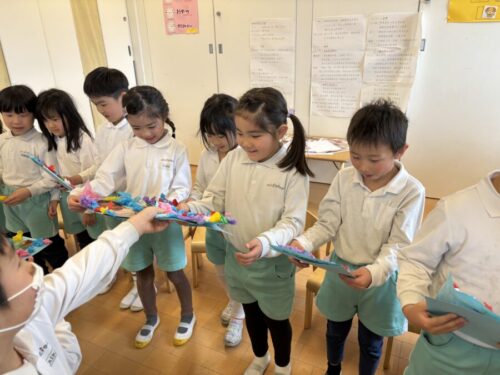 きりん・ぱんだ組さんから心のこもったプレゼントを渡すと、とっても嬉そうに喜んでくれていたくま組さん🩵
