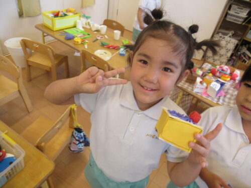 今日は雨が降っていたので、お部屋でお店屋さんごっこ製作を行いました!