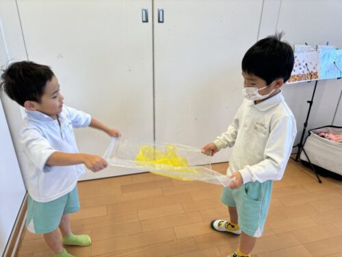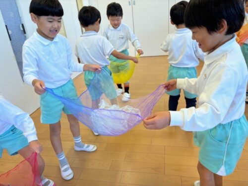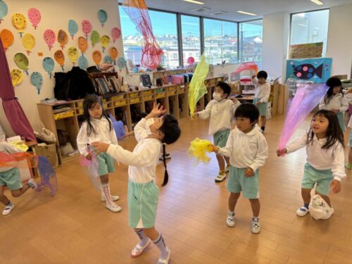 お友だちとスカーフを落とさないようにそっと揺らしたりして、とっても楽しそうに遊んでいましたよ😄