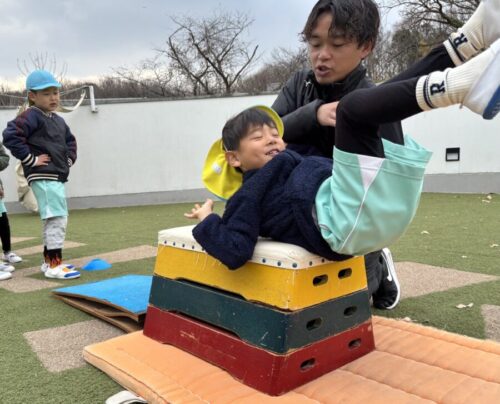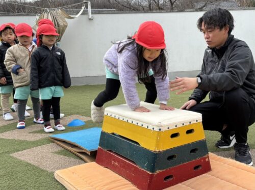 跳び箱の上で前転をするのは少し怖い様子も見られましたが、慣れてくると自信がつき楽しそうに参加していましたよ🌷