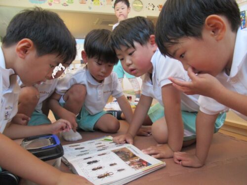 お部屋では、今日園の玄関で見つけたゴマダラカミキリを観察しながら、みんなで図鑑を見て調べていました