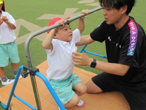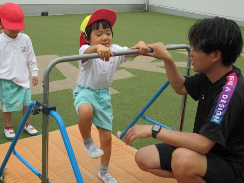 鉄棒をしっかり握って腕に力を入れて~😆成功できるとにっこり笑顔のみんなでした🍃