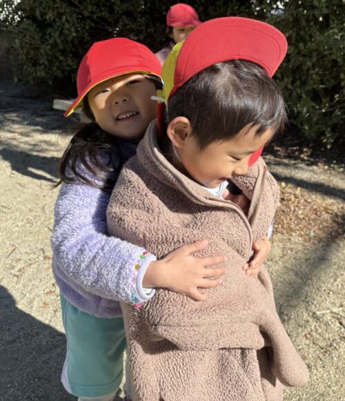 また、風が強くて寒かったのでお友だちとぎゅ〜っとしながらあったまる子もいました💞
