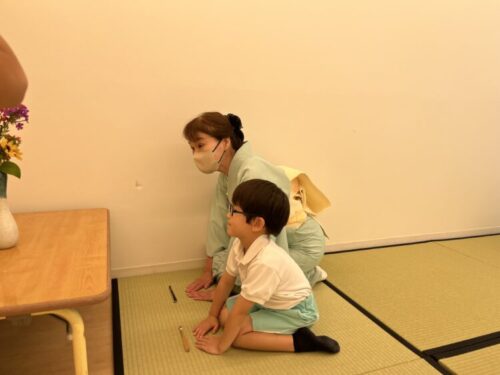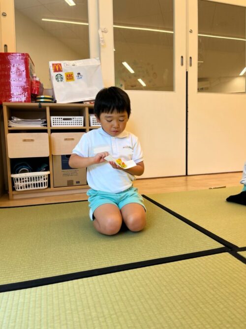 扇子を置いて、お花をみて、自分の席に行くことを先生と一緒に上手にできていましたよ![]()